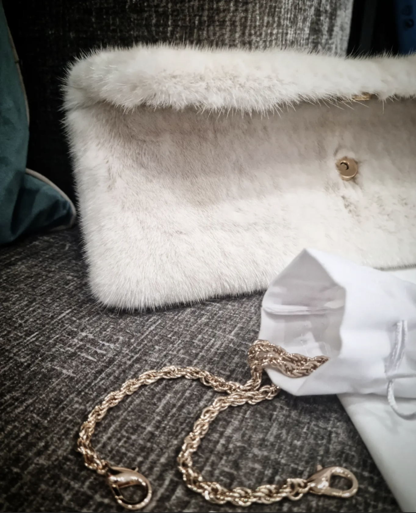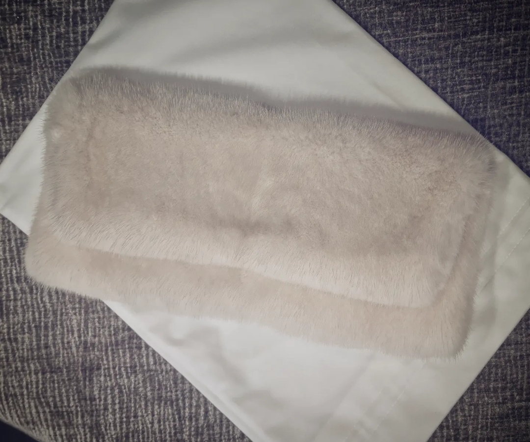 mit Fell überzogene Handtaschen sorgen für einen glamourösen Auftritt – hier: pearl-farbige Nerze.